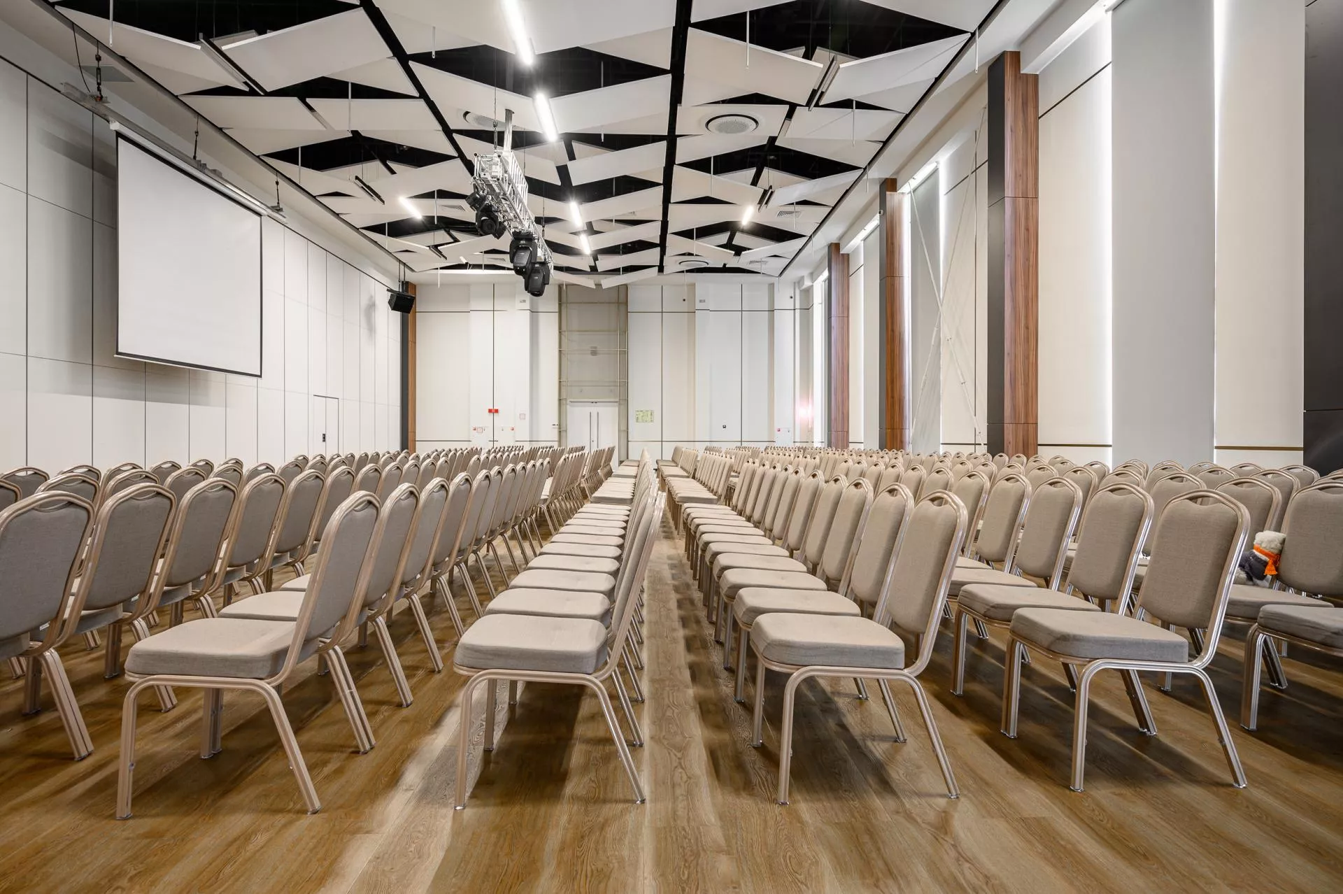 Этот зал предлагает уникальные возможности для проведения самых разнообразных мероприятий, от бизнес-конференций до масштабных выставок. Одним из его главных достоинств являются панорамные окна, которые занимают всю высоту стен и позволяют естественному свету свободно заливать пространство. Это не только визуально увеличивает площадь зала, создавая атмосферу открытости и легкости, но и позволяет выделить стильные архитектурные элементы и тщательно продуманные детали интерьера.