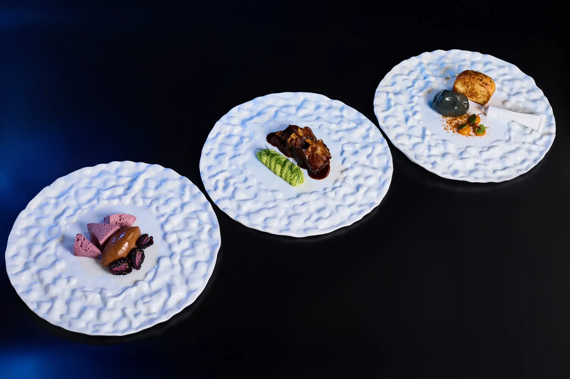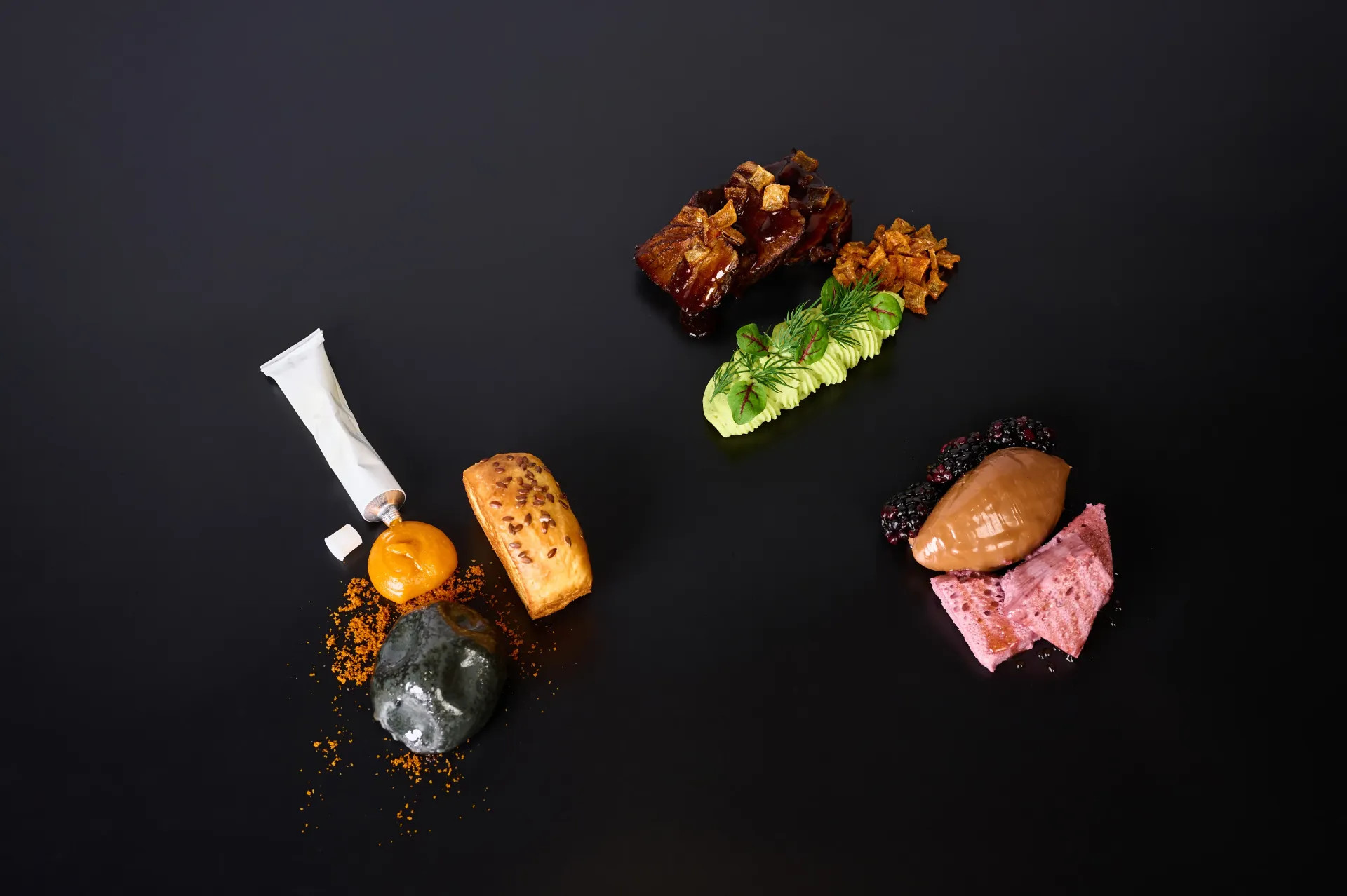 Основное блюдо – томленая мраморная грудинка. Квасная глазурь — память о земле, о чем-то родном и домашнем. Щавелевое пюре, как в тюбиках первого космонавта. Сегодня это знак уважения к истории: тот самый вкус, но переосмысленный. Сублимированный лук сверху — деталь, напоминающая о том, что в космосе продукты теряют вес, но не вкус.