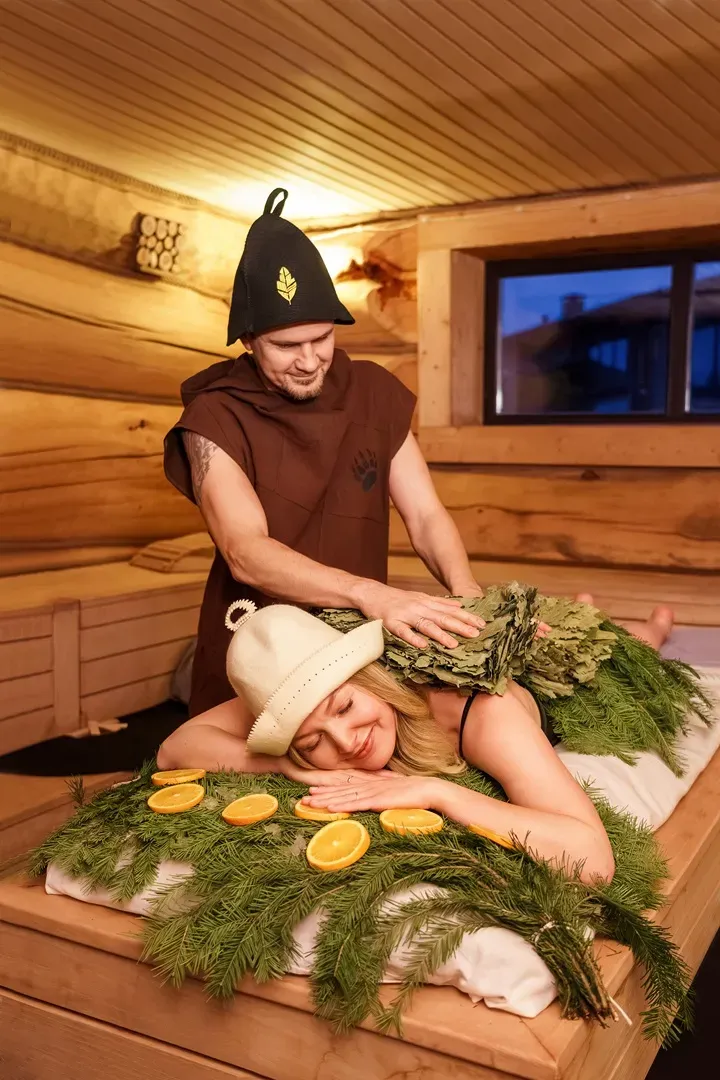 Ощутите, как тело наполняется теплом, а ум легким спокойствием. Глубокий прогрев всего организма в парнойоткрывает поры, усиливает кровообращение и подготавливает кожу к обновлению. Мягкий очищающий скрабудалит ороговевшие клетки, оставив кожу гладкой. Завершает процесс контраст минеральной водыс пузырьками, словно живительная мелодия, подчеркивающая чистоту и энергию тела. Аромат пихты окутываетвас насыщенным, древесным шлейфом, помогая глубже расслабиться и восстановиться.Процедура парения проходит в два захода.